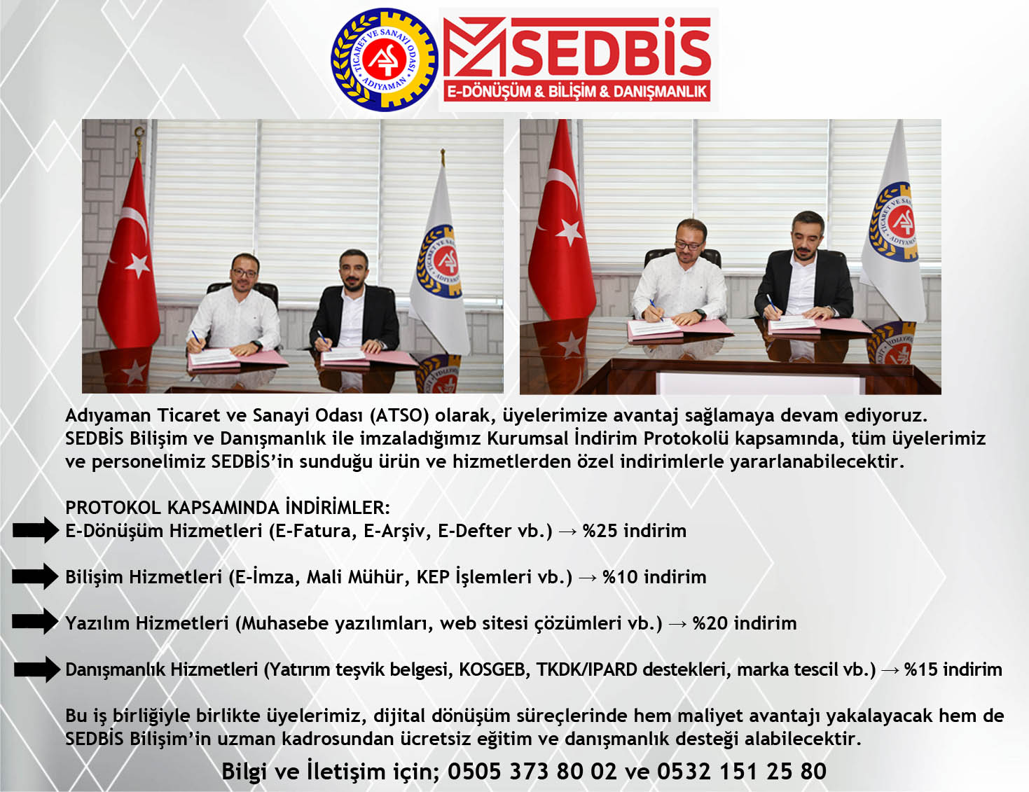 Sedbis Bilişim ve Danışmanlık ile imzaladığımız Kurumsal İndirim Protokolü kapsamında, tüm üyelerimiz ve personelimiz Sedbis’in sunduğu ürün ve hizmetlerden özel indirimlerle yararlanabilecektir.