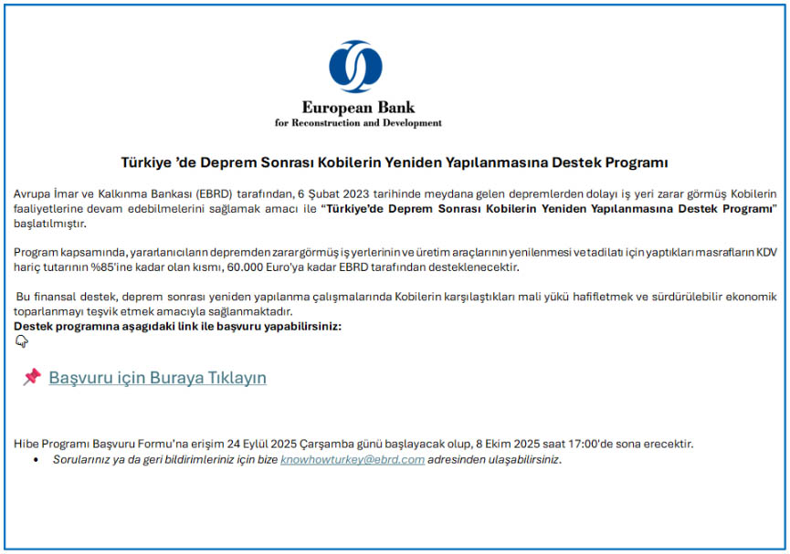 Avrupa İmar ve Kalkınma Bankası (EBRD) tarafından finanse edilen “Türkiye’de Deprem Sonrası Kobi'lerin Yeniden Yapılanmasına Destek Programı” kapsamında depremden etkilenen Kobi'lerin desteklenmesi hibe programı yürütülmektedir. Programın amaç ve öncelikleri aşağıda yer almaktadır.