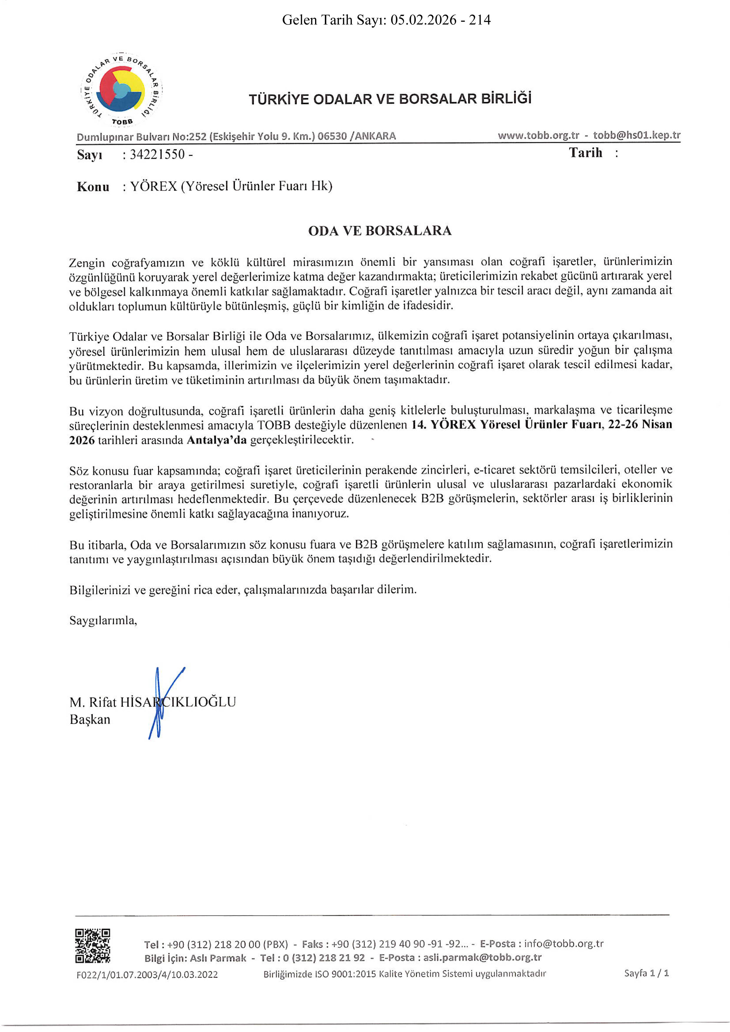 Türkiye Odalar ve Borsalar Birliği’nden Odamıza intikal eden yazıda; 22 - 26 Nisan 2026 tarihleri arasında Antalya'da 14. YÖREX Yöresel Ürünler Fuarı’nın düzenleneceği bildirilmiştir.